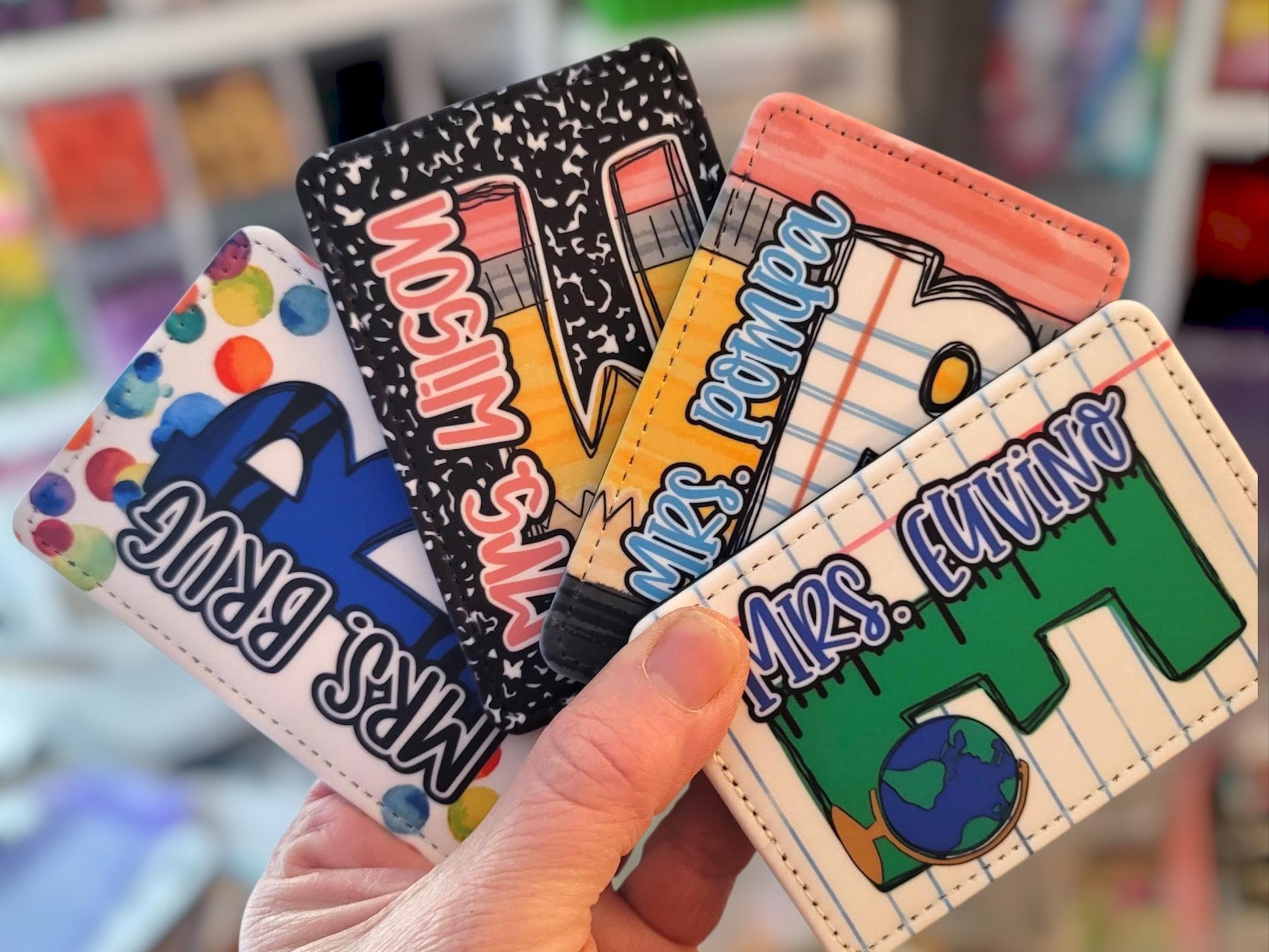 This personalized teacher ID badge holder features a whimsical pencil and notebook design that adds charm to your daily essentials. The durable PU leather material resists wear and tear, ensuring long-lasting use even in hectic school environments. With precise dimensions that fit standard ID cards and badges, it easily attaches to lanyards or slips into pockets without bulk.